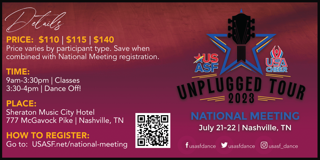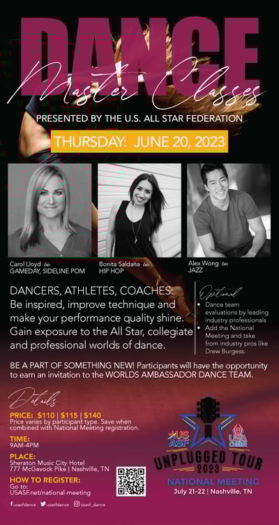 Come to Nashville for the Master Classes and stay for the National Meeting! With tracks for dancers, coaches, and studio directors, The Unplugged Tour will connect you with industry icons to network with coaches, directors, and field experts to help you gain the tools to build up your team successfully. This is your opportunity to create unstoppable momentum for the upcoming season!